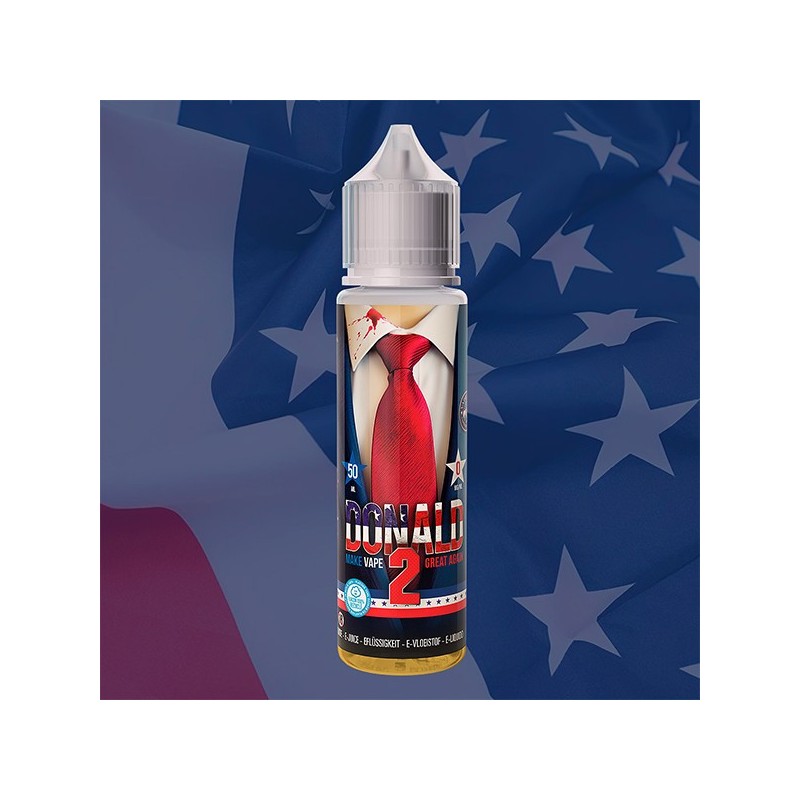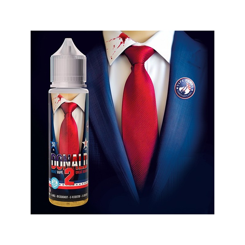 Donald 2 se présente dans un format généreux de 50ml, idéal pour les vapoteurs réguliers. Sa composition sans nicotine (0mg/ml) permet une utilisation sereine, tout en laissant la possibilité d'ajouter un booster de nicotine selon les préférences personnelles. Le ratio 30/70 PG/VG offre un équilibre parfait entre hit en gorge et production de vapeur.