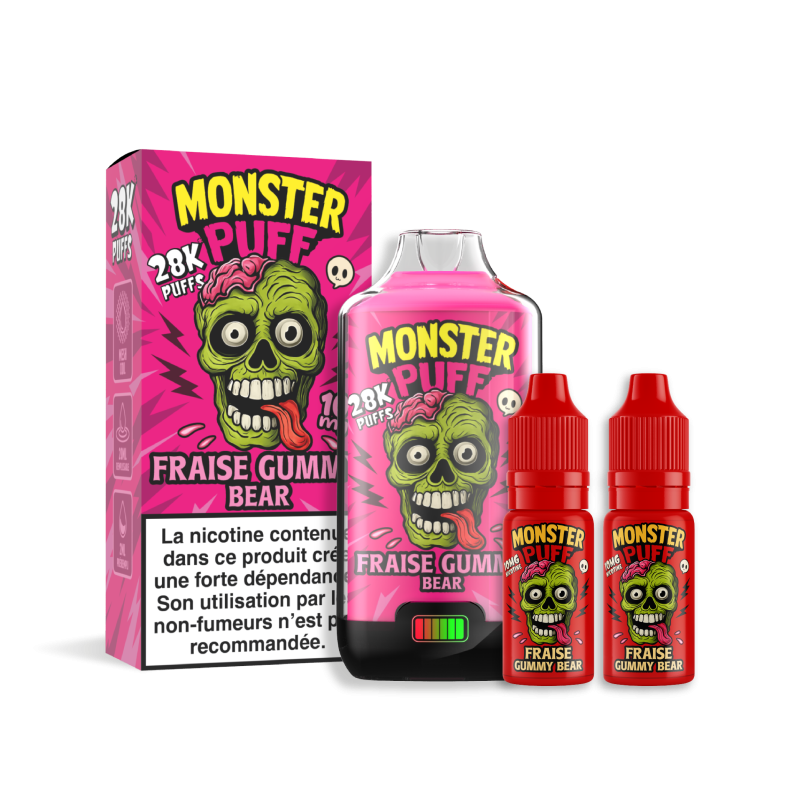 Le kit comprend 1 e-cigarette Monster Puff rechargeable remplie et 2 bouteilles de e-liquide 10ml de la même saveur Fraise Gummy Bear.