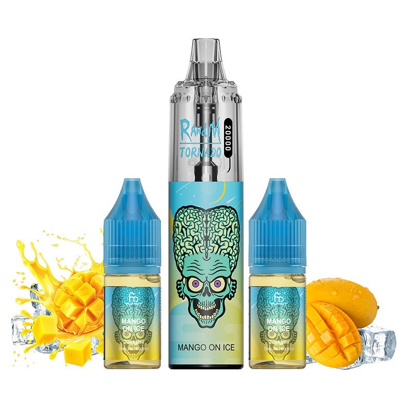 Le kit comprend 1 dispositif Puff Tornado RandM 850mAh avec réservoir vide et 2 flacons de 10ml de la saveur Mango on Ice en 20mg de sels de nicotine. Le câble USB-C n'est pas inclus.