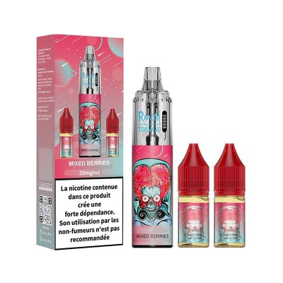 Le kit comprend 1 dispositif Tornado RandM 850mAh (réservoir non rempli) et 2 flacons de 10ml d'e-liquide Mixed Berries aux sels de nicotine 20mg, soit 20ml au total.